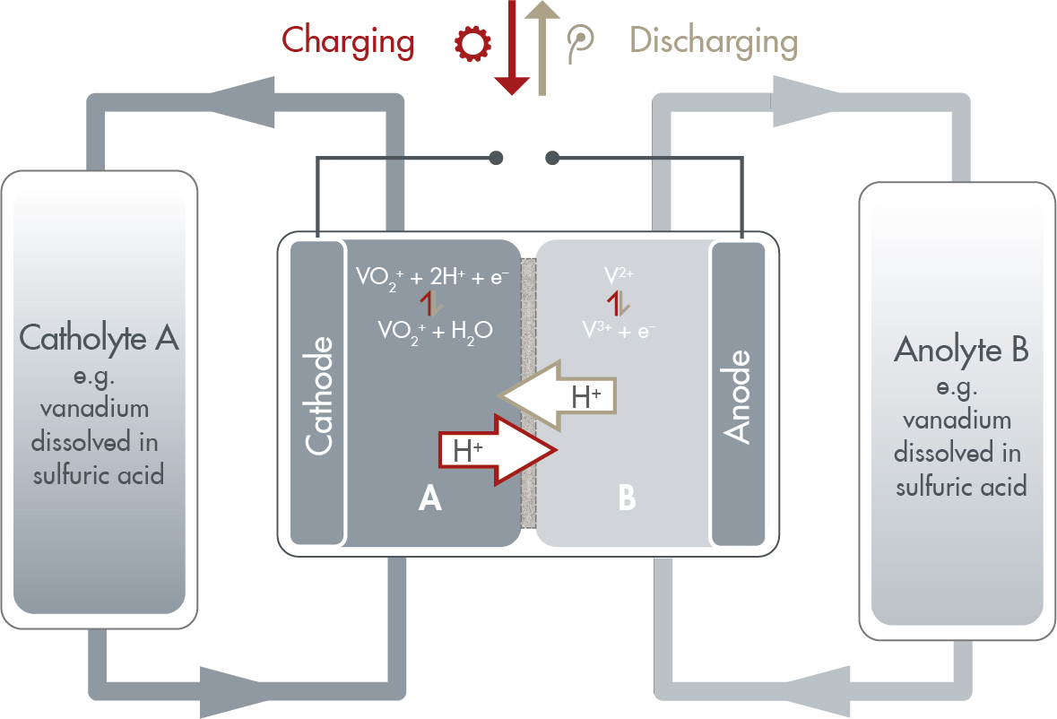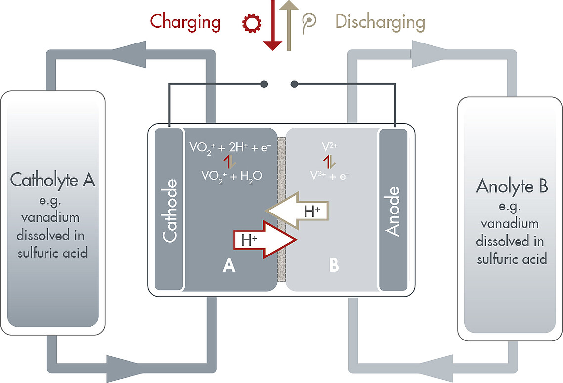 Green hydrogen is generated using renewable energy. This type of climate-friendly energy strongly depends on the existing climatic and weather conditions. This is why energy storage is essential to provide electricity even when the sun is not shining or when there is no wind. One storage method involves scalable redox flow batteries that store electricity in the form of chemical energy. The system comprises tanks with chemical components dissolved in liquids and battery cells: electricity is saved in the electrolyte when energy is introduced into the system; energy is withdrawn from the electrolyte when electricity is fed into the power network.