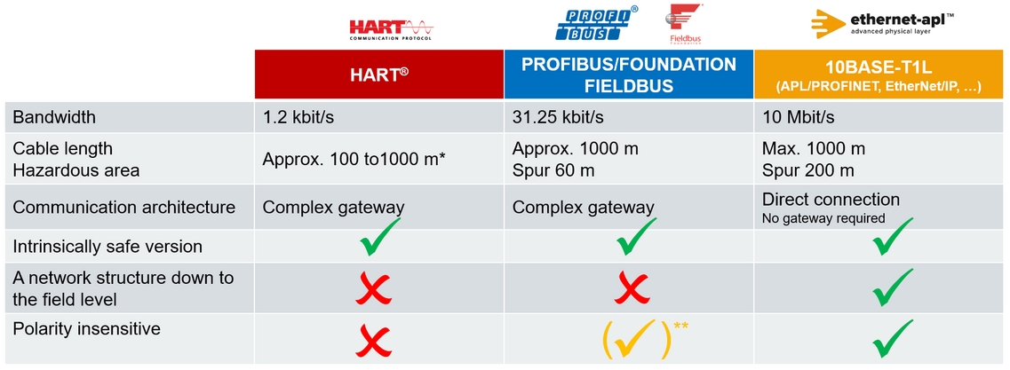 The Advanced Physical Layer (APL) describes a physical transmission layer, which makes homogeneous Ethernet communication possible all the way down to field level and in hazardous areas. Conventional fieldbus Type A cables, which comply with IEC 61158-2 requirements, can be used. The two-wire installations are suitable for intrinsically safe zones and have reverse polarity protection. They allow 10 Mbit/s communication and power supply over one single cable.