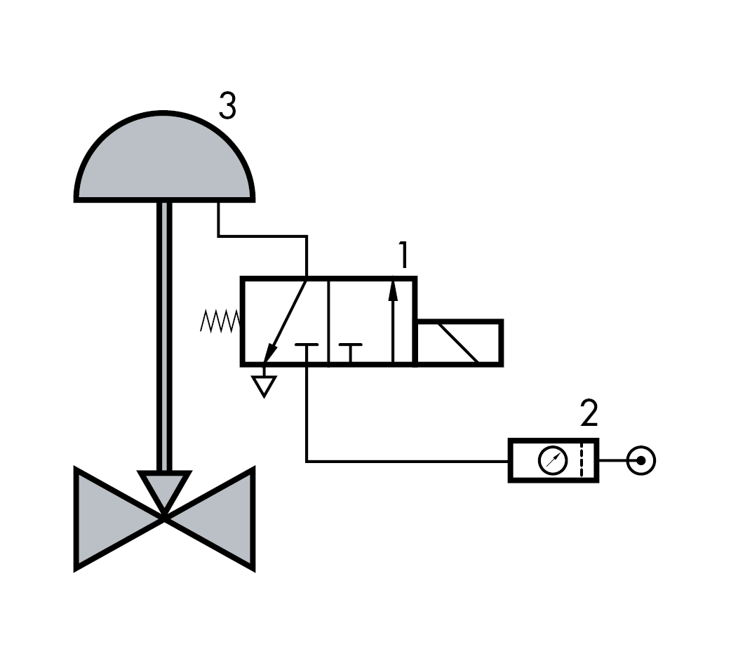 In the event of emergency, the solenoid valve ensures that the actuator is vented and moves to the fail-safe position. In throttling service, an external pilot supply of the solenoid valve is always necessary.
